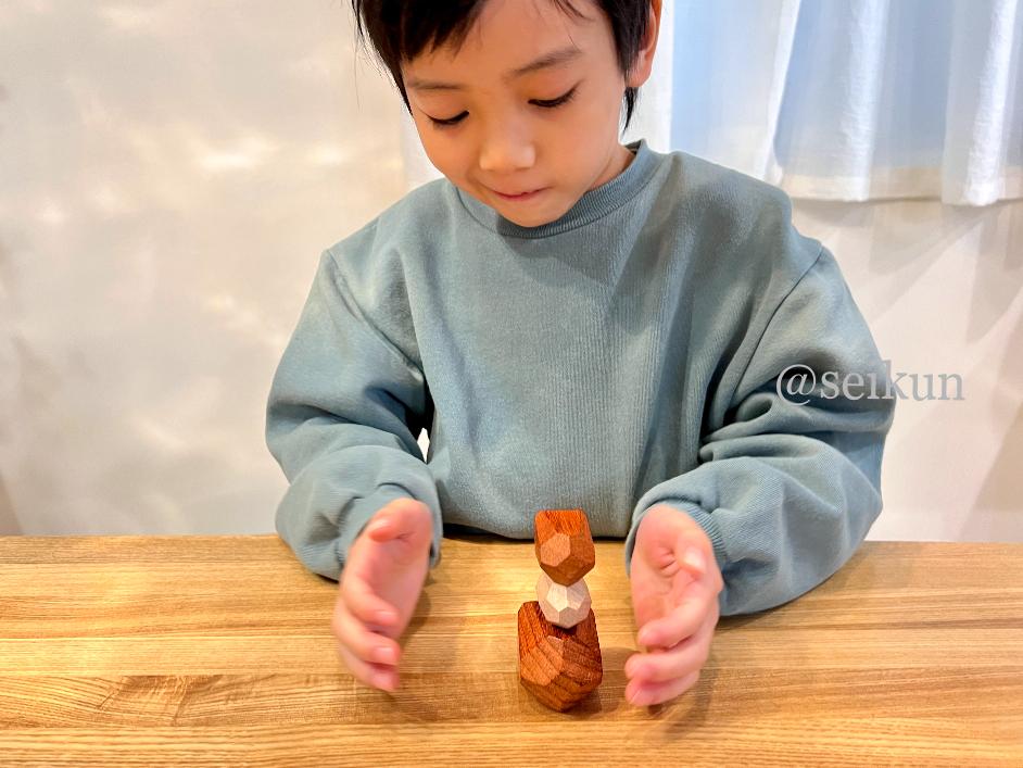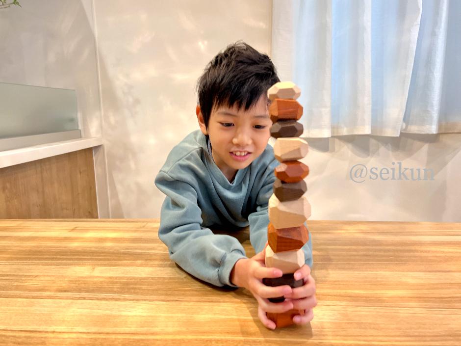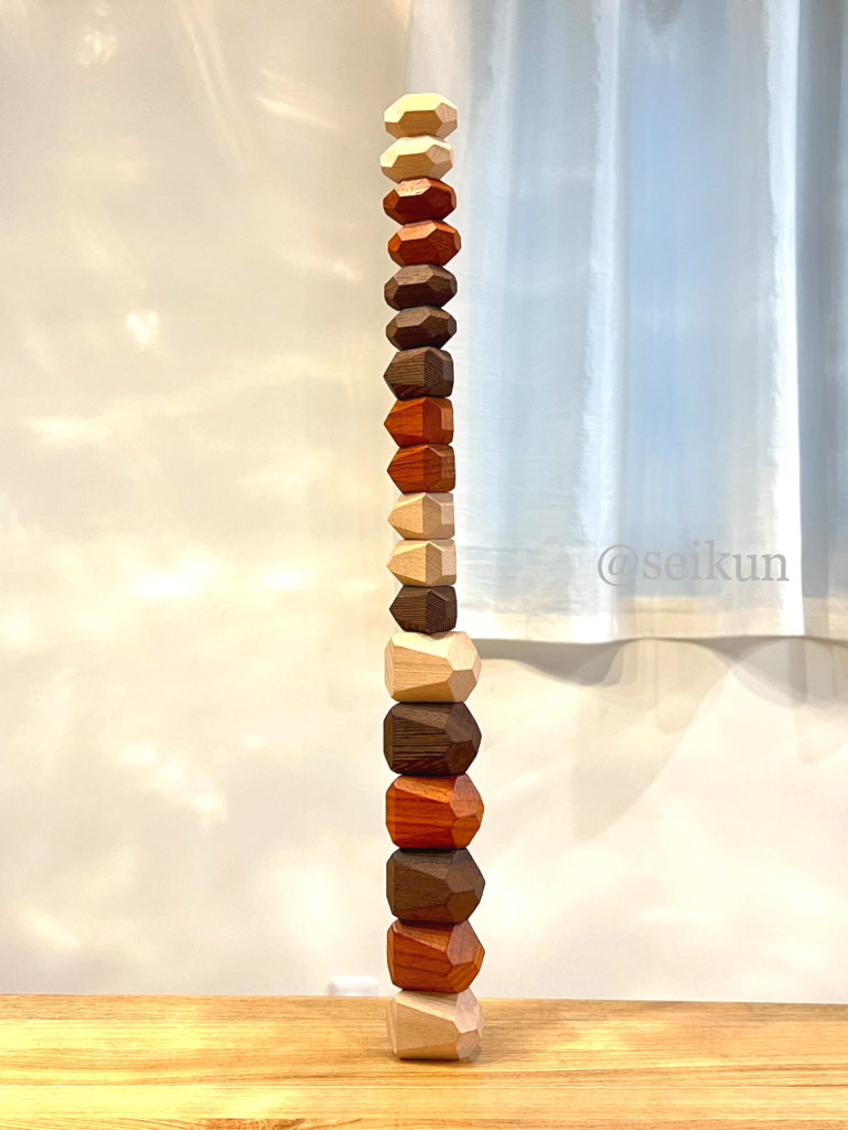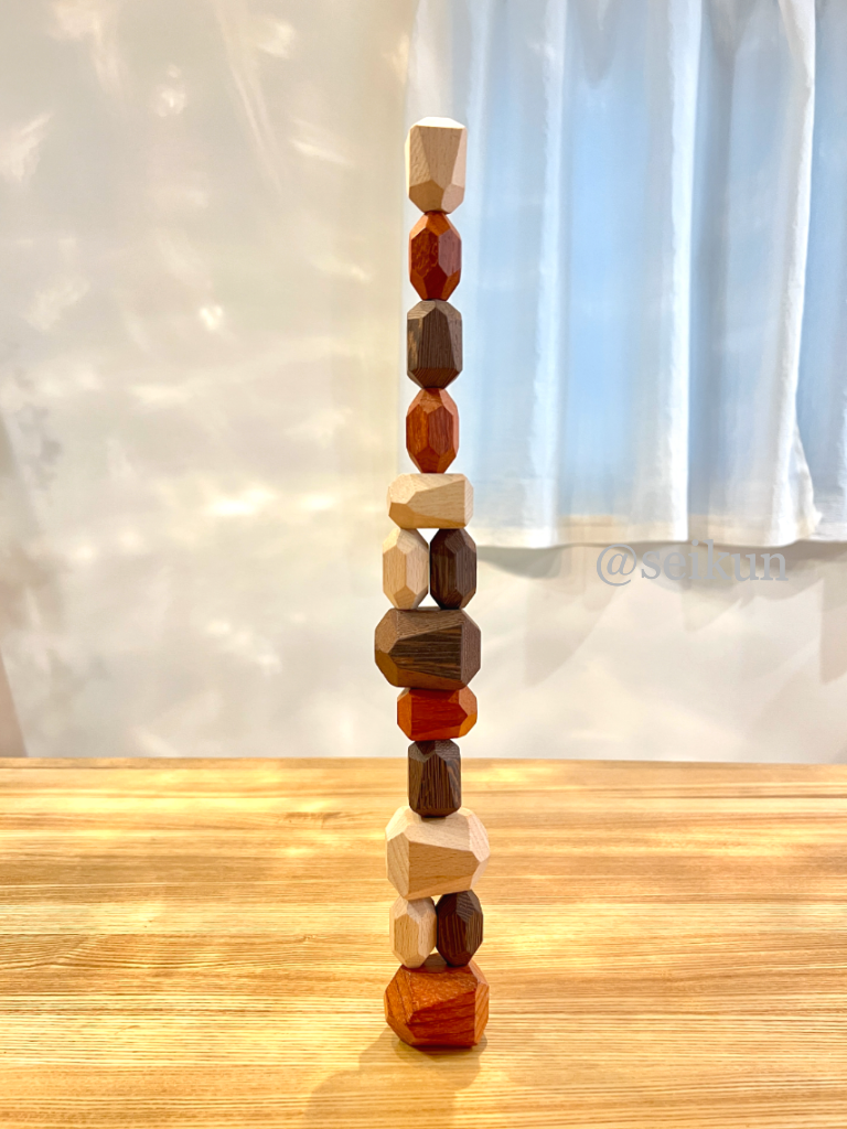 通常の四角い積み木に比べ、接する面が小さいので、積むのがとても難しくなっています。